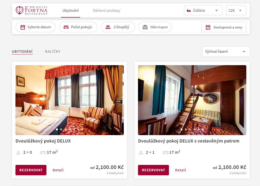 Velký posun zaznamenala i nabídka pobytových balíčků a ubytovacích voucherů. Ve výchozím stavu funguje rezervační systém jako globální nástroj prodeje, kde si host může rezervovat nejen ubytování, ale všechny vaše služby. Přehledně tedy může volit mezi pokoji, balíčky či vouchery. Samozřejmostí pro nás je, že se vám rezervační systém přizpůsobí a můžete mít i jedinečnou nabídku pouze balíčků.